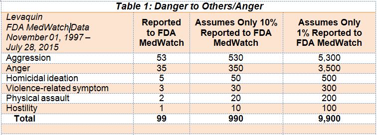As you can see from the table below, according the FAERS data on Levaquin, there have been between 990 to 9,900 adverse events pertaining to a “Danger to Others/Anger.” This is obviously very disturbing that an antibiotic, which is often given out for routine infections, may result in a level of violence or anger toward others. These “Danger to Others/Anger” Adverse Events are not listed on the Levaquin label anywhere.