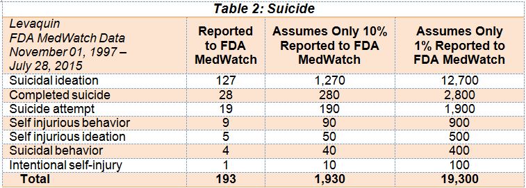 Furthermore as evidenced by the table below, there have been 1,930 to 19,300 adverse events pertaining to “Suicide.” It is terribly disturbing that 280 to 2,800 have “completed suicide.” And again, it is obviously very disturbing that an antibiotic for routine infections may result in this level of Suicide-related Adverse Events. Although suicide is on the Levaquin label, (“rarely, suicidal thoughts or acts”), because of the obvious seriousness of this adverse event, it needs to be in a Black Box warning as Dr. Bennett requested in his Citizen Petition submitted to Dr. Hamburg, then FDA Commissioner, September 2014.